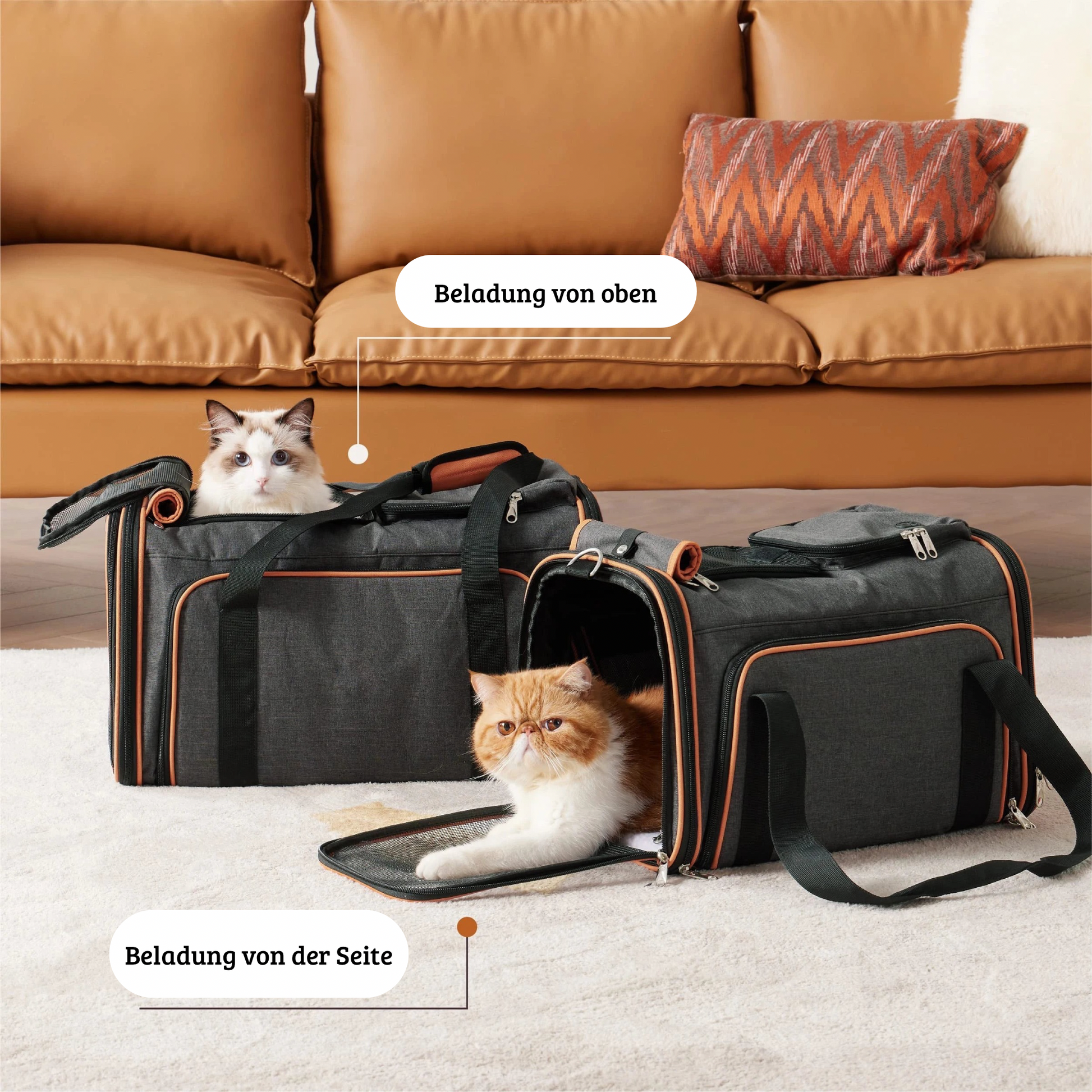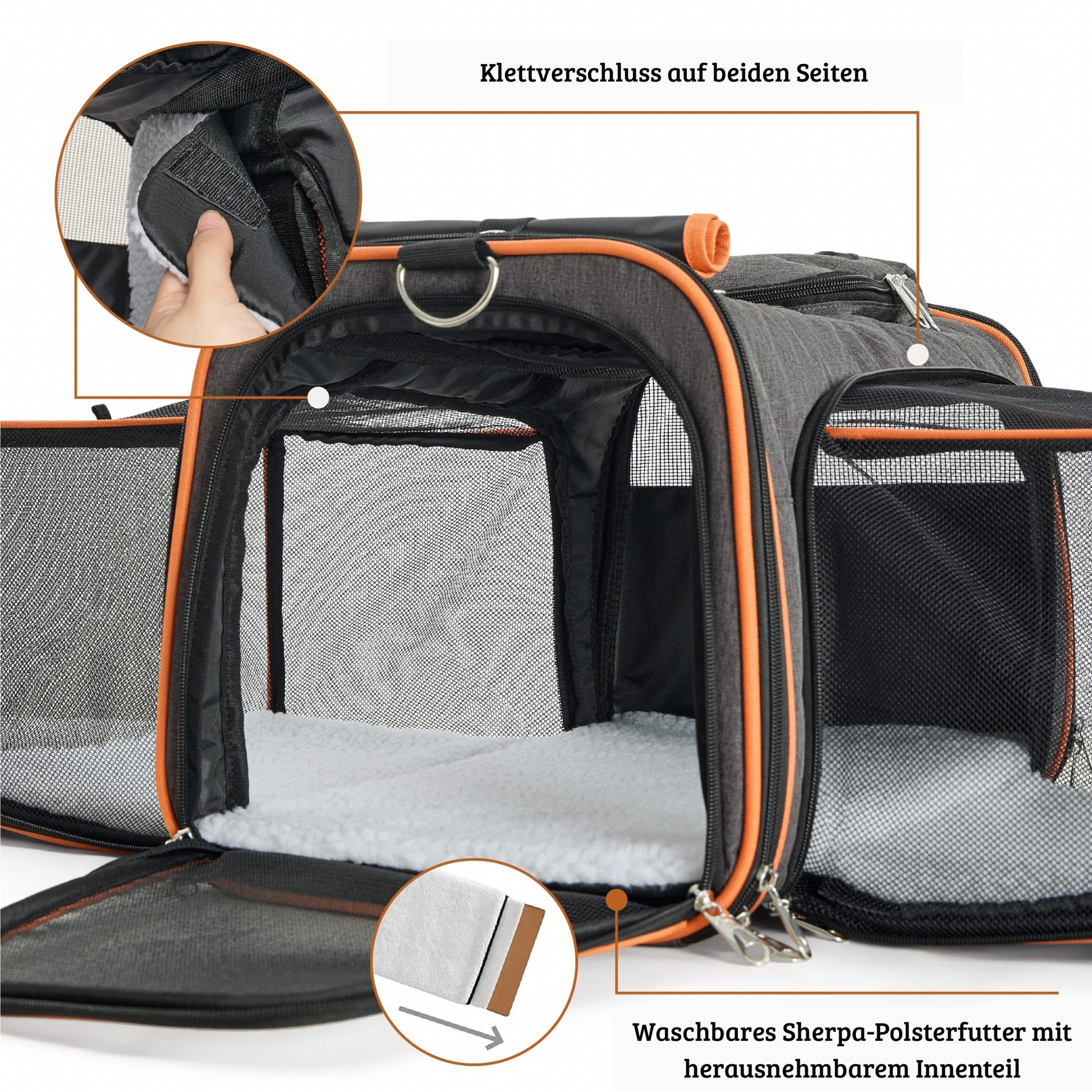 Besonders praktisch: Die Tasche ist beidseitig erweiterbar, sodass dein Tier unterwegs mehr Bewegungsfreiheit hat – ideal bei längeren Reisen oder Wartezeiten. Wird sie nicht erweitert, bleibt sie kompakt und handlich.