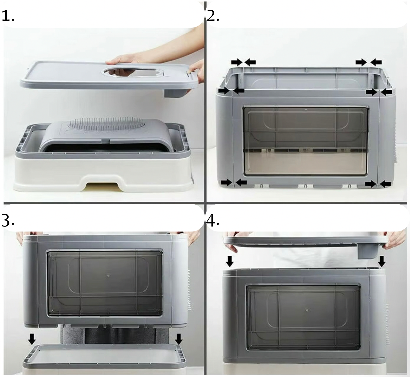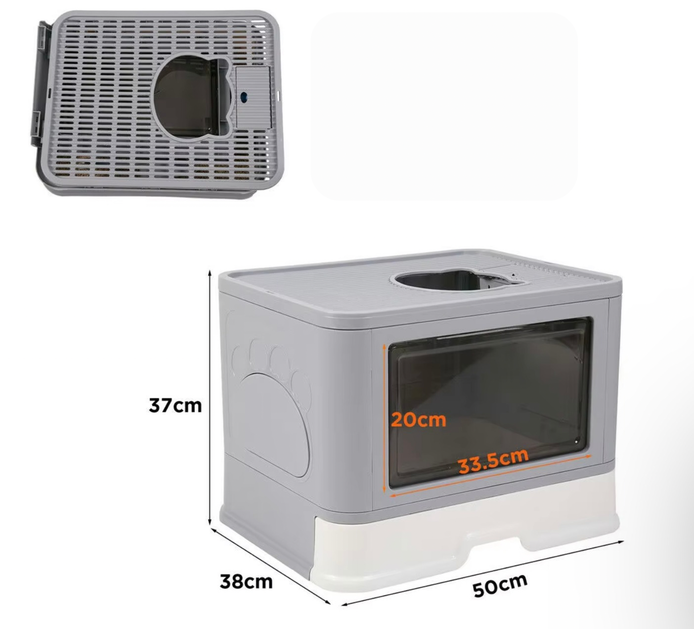Das faltbare Katzenklo bietet eine Lösung für all diese Probleme. Durch sein innovatives Design mit Front-Eingang und Top-Ausgang reduziert es die Verbreitung von Streu erheblich. Der geschlossene Aufbau minimiert Gerüche und schafft eine geschützte, komfortable Umgebung für Ihre Katze. Dank der integrierten Schublade wird die Reinigung kinderleicht und hygienisch. Das kompakte, faltbare Design spart Platz und ermöglicht es, das Katzenklo einfach zu verstauen, wenn es nicht in Gebrauch ist.
