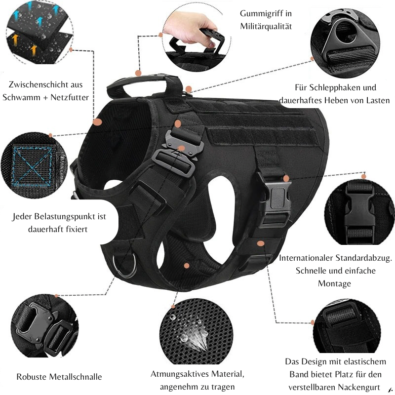 Ein besonderes Merkmal des Militär Geschirrs ist seine außerordentliche Strapazierfähigkeit. Es besteht aus hochwertigen, wasser- und reißfesten Materialien, die auch bei intensiver Nutzung und in rauen Umgebungen standhalten. Egal, ob Sie durch den Wald wandern, in den Bergen trainieren oder einfach durch den Park spazieren gehen – das Geschirr bietet maximale Sicherheit und Haltbarkeit.