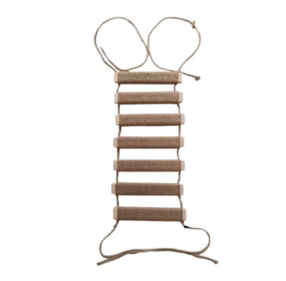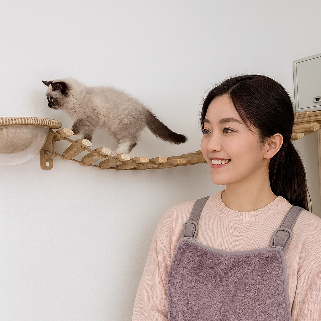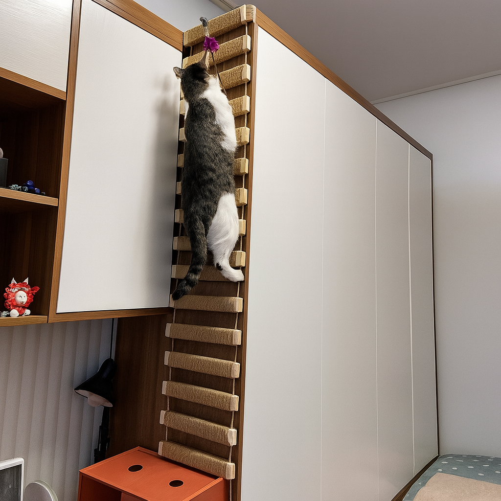 Die Kombination aus einer stabilen Wandbrücke und einer Hängeleiter ermöglicht Deiner Katze mehrere Bewegungsrichtungen: vom ruhigen Liegebrett über das langsame Überqueren bis zum schwungvollen Sprung oder dem Hänge-Erlebnis. Dadurch förderst Du nicht nur ihre körperliche Aktivität, sondern auch ihre geistige Herausforderung — denn das Navigieren, Balancieren und Erkunden verlangt Konzentration und Geschick.