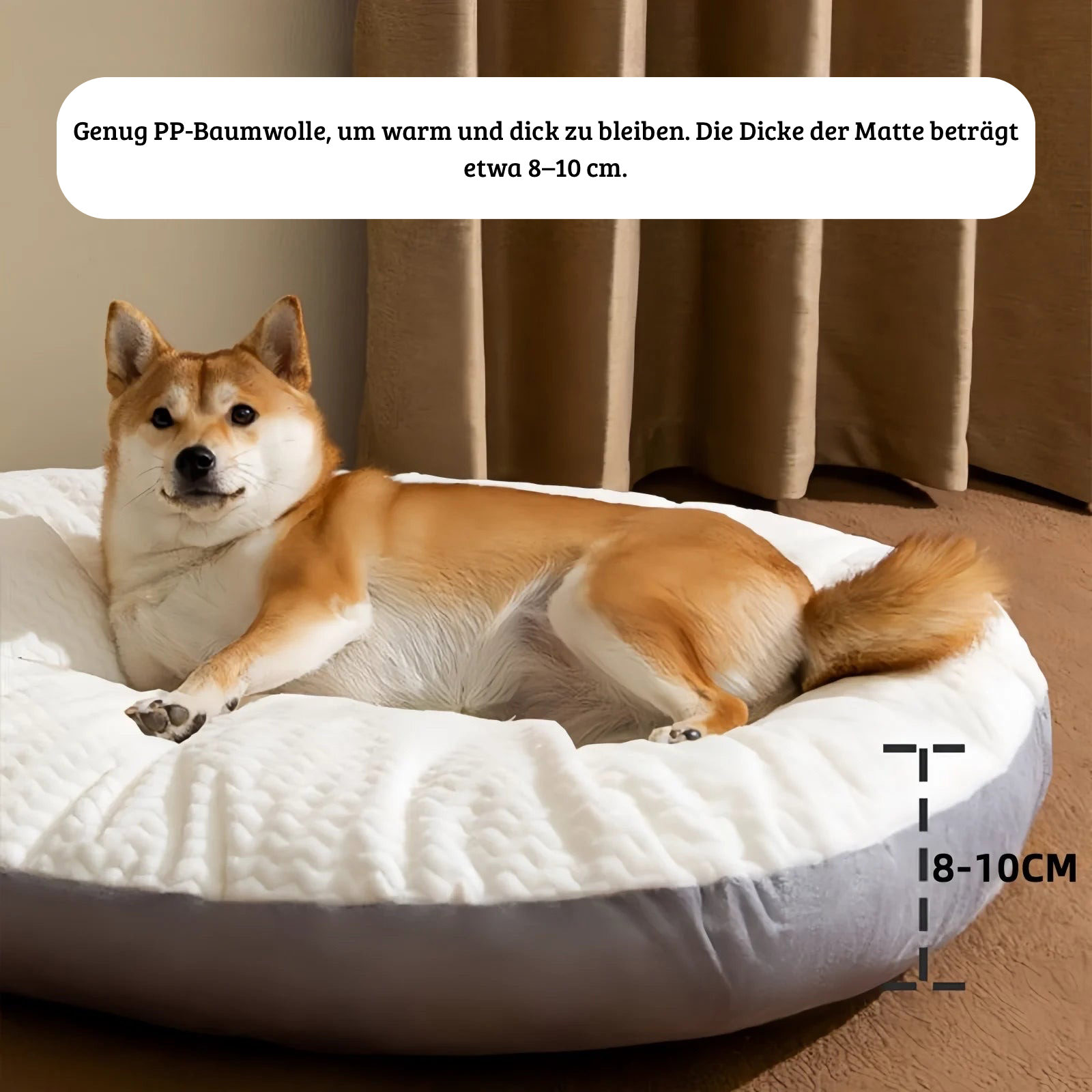 Das Bett besteht aus hochwertigem, weichem Stoff, der nicht nur kuschelig, sondern auch äußerst strapazierfähig ist. Es hält auch intensiver Nutzung stand und bleibt lange in Form – perfekt für Hunde, die sich gerne einkuscheln und ausstrecken.