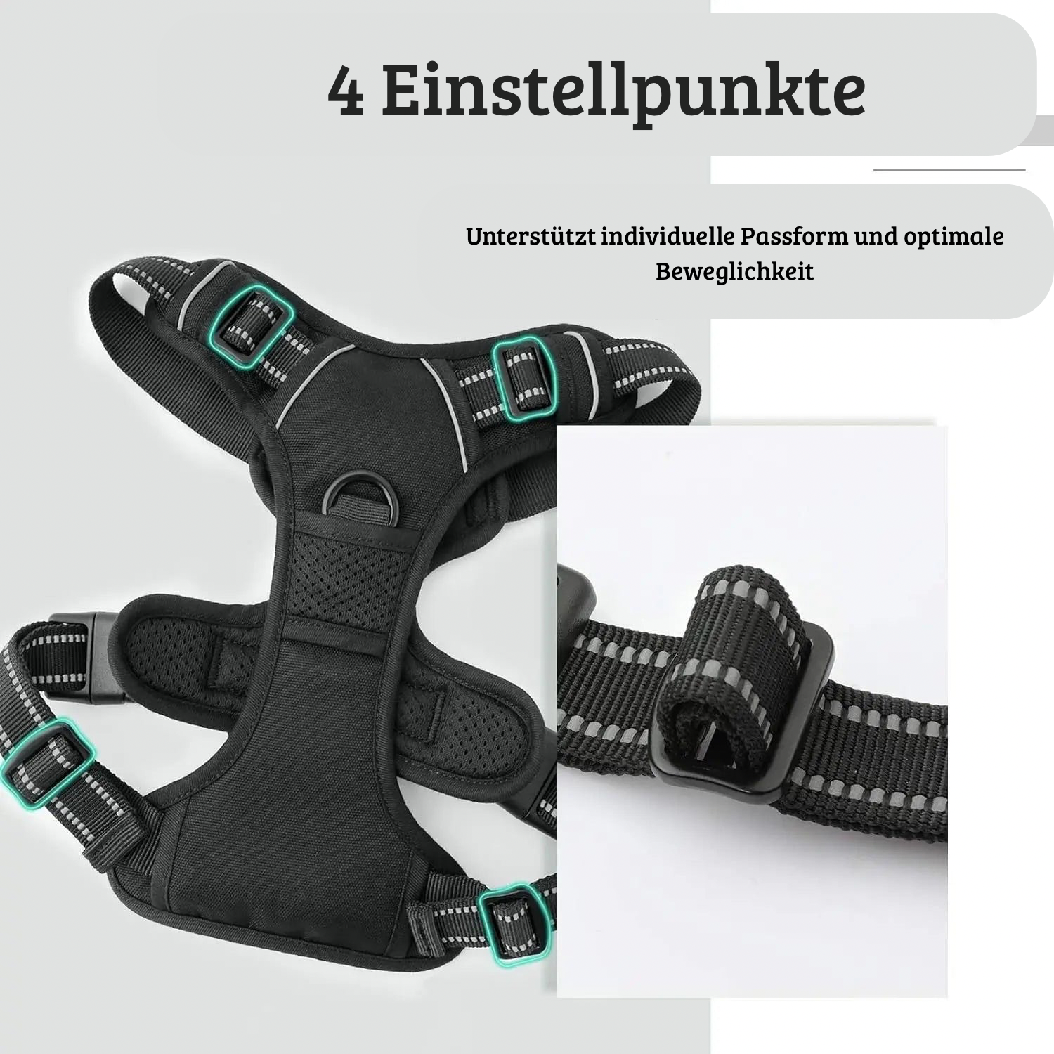 Die Gurte sind individuell einstellbar und sorgen für einen perfekten Sitz, ohne die Bewegungsfreiheit einzuschränken. Das weiche Innenfutter schützt vor Reibung und macht das Geschirr auch bei längeren Spaziergängen angenehm zu tragen.