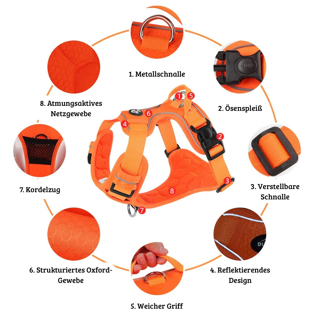 Dieses hochwertige Hundegeschirr wurde entwickelt, um Ihnen mehr Kontrolle beim Spaziergang zu bieten und gleichzeitig den Komfort und die Sicherheit Ihres Hundes zu gewährleisten.